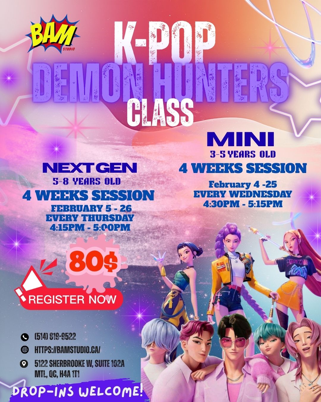 Join us for a high-energy 4-week dance adventure inspired by the exciting world of K-Pop Demon Hunters! Kids will learn fun, age-appropriate K-popβstyle choreography while building confidence, coordination, musicality, and teamwork.